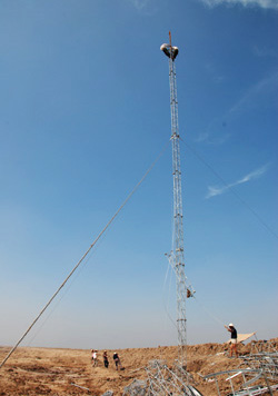 正三角形布置形式以及鋼絞線拉線固定方式,大大降低塔身自重 ;風(fēng)荷載系數(shù)小,基礎(chǔ)形式簡單,占地少(一般0.25m×0.25m),對承重物破壞較小,樓面基礎(chǔ)施工便利 ,可設(shè)計(jì)多層平臺,承載能力較高,可掛載多副天線和微波傳輸設(shè)備;在樓面上施工時,由于樓面周圍維護(hù)結(jié)構(gòu)多,拉線固定方便,施工速度大大加快;在山坡上施工時,可利用山坡優(yōu)勢進(jìn)行拉線固定,安裝便捷、施工速度快;構(gòu)件輕、占地少、對承載物的破壞小。