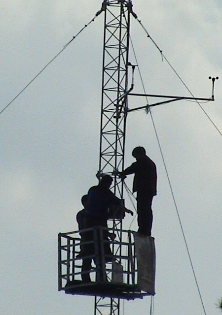正三角形布置形式以及鋼絞線拉線固定方式,大大降低塔身自重 ;風(fēng)荷載系數(shù)小,基礎(chǔ)形式簡單,占地少(一般0.25m×0.25m),對承重物破壞較小,樓面基礎(chǔ)施工便利 ,可設(shè)計多層平臺,承載能力較高,可掛載多副天線和微波傳輸設(shè)備;在樓面上施工時,由于樓面周圍維護結(jié)構(gòu)多,拉線固定方便,施工速度大大加快;在山坡上施工時,可利用山坡優(yōu)勢進行拉線固定,安裝便捷、施工速度快;構(gòu)件輕、占地少、對承載物的破壞小。